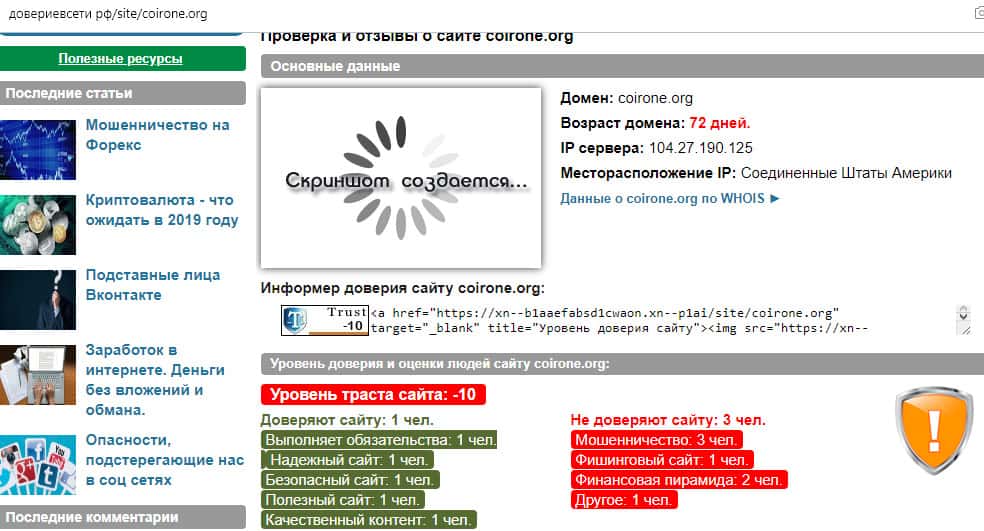 Проведя анализ интернет-ресурса конторы Coirone Org на отзывы и внутреннюю информацию о домене, удалось узнать, что возраст домена составляет 72 дня на момент написания статьи, а уровень траста и доверия, оставляют желать лучшего. Так что доверьтесь общественному мнению и не ведитесь на уловки Коирон.