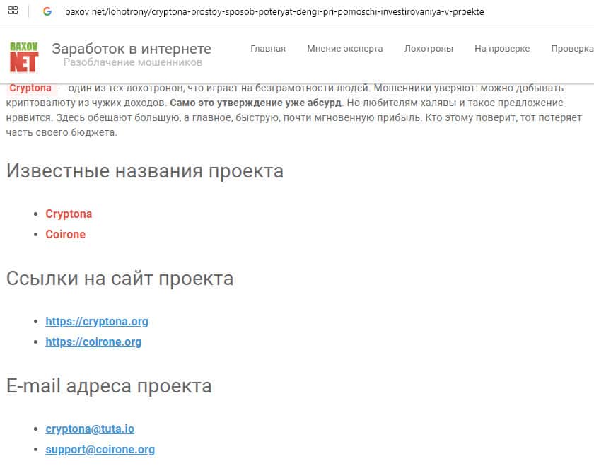 Как нам стало известно из различных интернет-источников, лохотрон Коирон это уже второе название одного и того же мошеннического проекта. До этого он назывался Cryptona и располагался на сайте cryptona org. Теперь этот сайт не работает, весь сайт перенесли на другой домен и продолжают обворовывать наивных лохов.