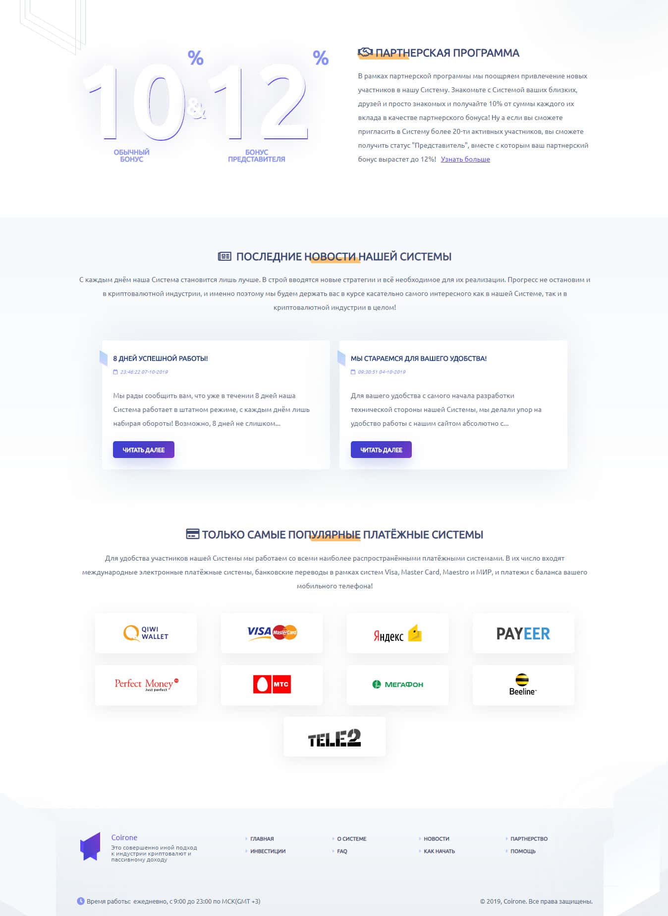 По сайту конторы Коирон можно сказать следующее, что он сделан в довольно кустарных условиях, так как для подобных криптовалютных играх серьезность не нужна. Основной посыл, который основатели пытаются донести до интернет-пользователей - это "вложите деньги и мы отдадим в разы больше". На что собственно и ведутся лохи.