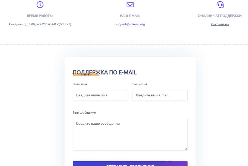 Чтобы опрокинутые клиенты не докучали разводилам из конторы Coirone Org, то они решили этот вопрос, путем предоставления контактов для связи в виде электронной почты, онлайн чат-поддержки. Поэтому мы решили оставить их почту здесь, дабы вы не попались случайно на их удочку: