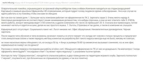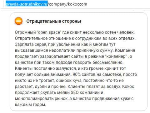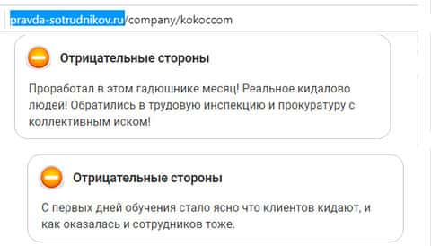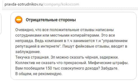 На одном из популярных информационных сайтов о работодателях найден примечательный материал о компании Кокос Груп. Один из бывших сотрудников описал здесь свое негативное отношение к данной конторе, назвав ее местом лжи и обмана, тщательно прикрывающимся за красивой обверткой.