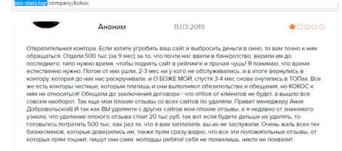 Еще один примечательный отзыв о недобросовестных действиях конторы Кокос Груп, которая, для того чтобы вводить в заблуждение интернет-сообщество и уже дальше кидать на деньги всех тех кто клюнул на ихнюю фальшивую красочную обвертку якобы солидной организации, покупает себе передовые местах в рейтингах аналогичных компаний.