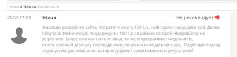 Человек по имени Женя описал свой плачевный опыт взаимодействия с шарашкиной конторой Кокос Груп, которая взяла с него деньги на сумму в размере 150 тысяч рублей и не выполнила надлежащим образом свою работу. Также автор сей публикации упоминает в комментарии, мягко говоря, не совсем профессиональные действия представителя Kokos Group, которые по итогу вообще перестал выходить на связь с клиентом.