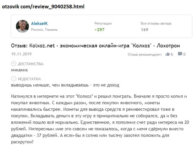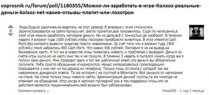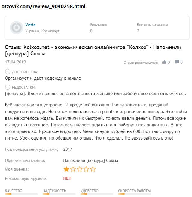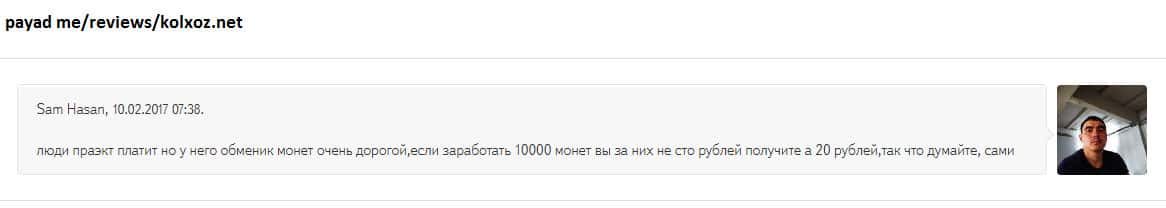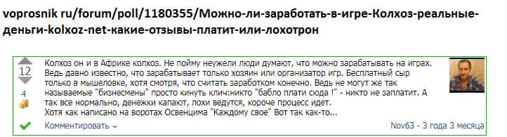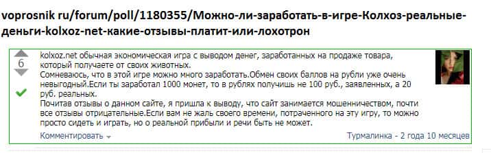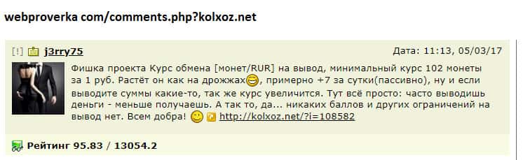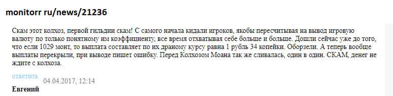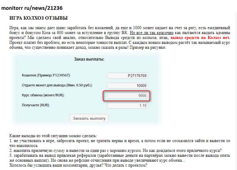 Мнение о лоховозке Kolxoz Net неоднозначно и двояко! С одной стороны, конторы как бы платит игрокам, но с другой стороны - платит копейки! Все дело в неадекватном крусе обмена! При каждом выводе средств из игры происходит понижение курса практически вдвое! Для примера, реальная ставка при обмене за 10 000 монет - пользователь получает всего 1,10 руб!