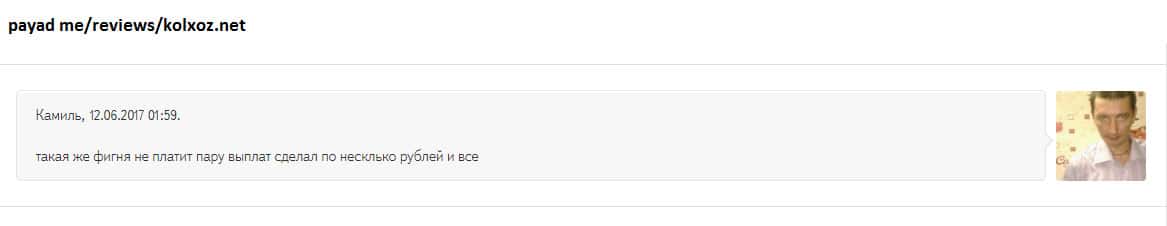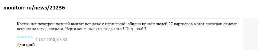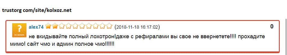 Парадокс лоходойки Колхоз Нет состоит в том, что он функционирует с 2016 года и по сто раз провернул одни и те же мошеннические схемы над юзерами! А многочисленные жалобы и негативные отзывы в сети не останавливают желающих буратин подзаработать с шарагой Колхоз Нет. Причем, некоторые юзеры даже по несколько раз наступают на одни и те же грабли!