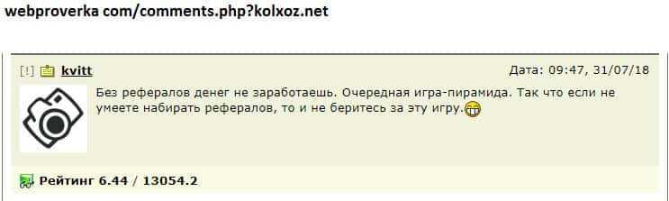 Kolxoz Net - это типичный хайп или финансовая пирамида! Мошенники специально руками наивных пользователей проворачивают свои схемы! Чтобы юзер мог вывести свои деньги из игры, он должен привлечь новых рефералов, которые обязаны пополняться для дальнейшей деятельности! Вот и получается, что одни юзеры втягивают за собой в шарагу Kolxoz Net других!