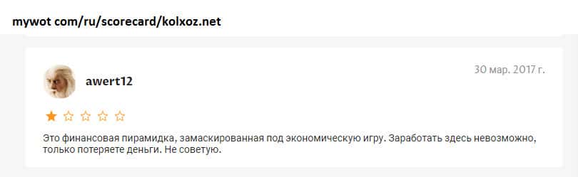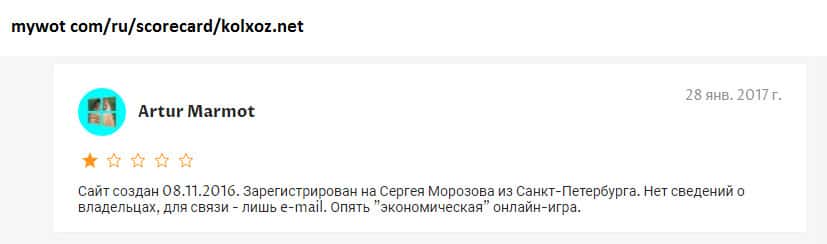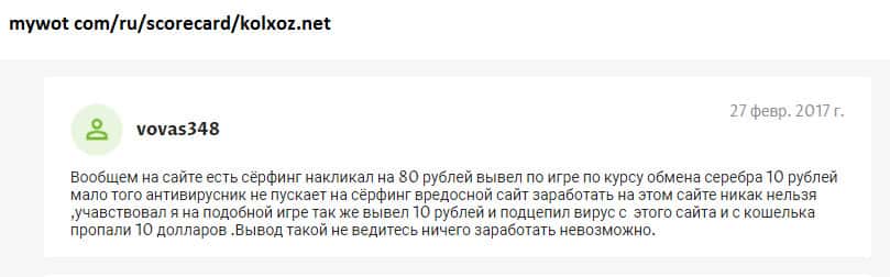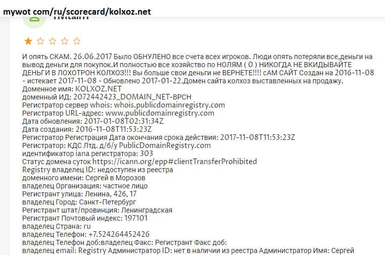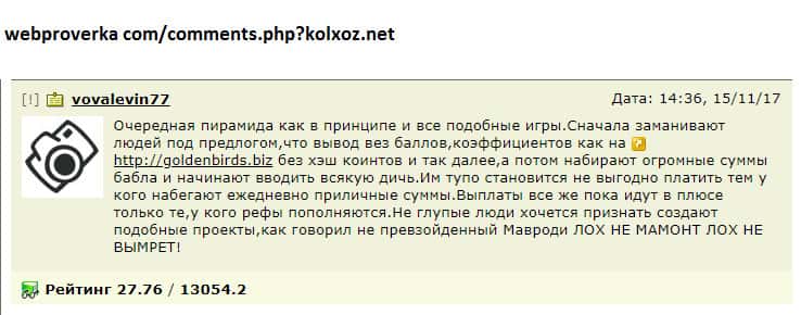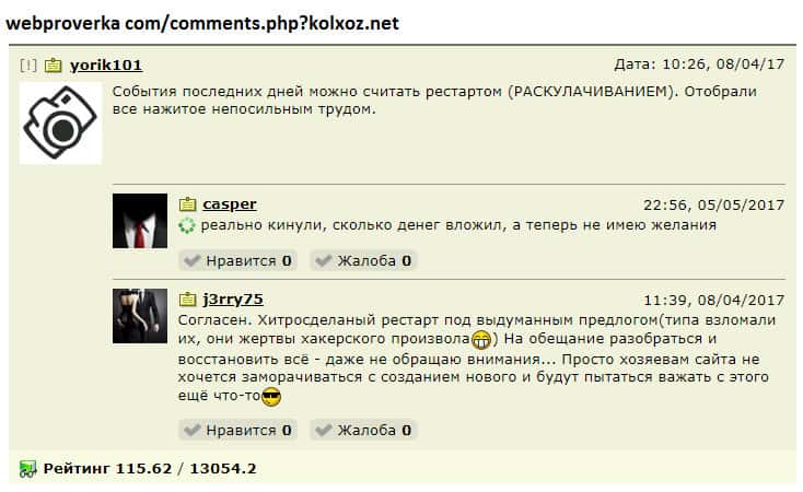 Существуют разные способы проверки интернет-проектов на причастие к мошенническим действиям! На одном авторитетном источнике проверялась контора Kolxoz Net и результаты не впечатлили! За свое долгое существование экономическая онлайн игра Kolxoz Net не зарекомендовала себя среди юзеров! Нет ни одной положительной оценки работе лоховозки!!!