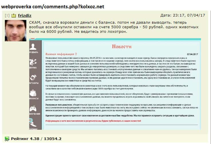 Жулики Колхоз Нет стабильно часто практикуют мошенническую схему развода со сливом всех аккаунтов игроков! На своем сайте лоховоды любят писать, что на них была совершена хакерская атака и теперь все достижения игроков обнуляются! Бывает в ленте новостей другая легенда - администрация решила улучшить качество игры! Но зачем тогда сливать свой сайт?