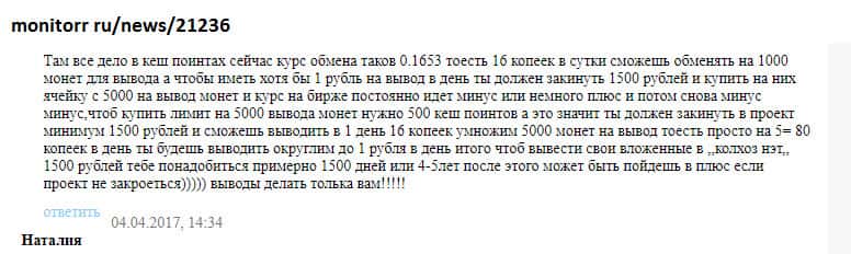 Шарамыжная пирамида Kolxoz Net на каждом этапе одурачивает наивных игроков! С самого начала шарлатаны разводят юзеров на скрытых условиях работы. Когда процесс уже запущен и пользователь начинает прокачивать свою ферму - начинают всплывать различные нюансы! То для вывода средств нужны кэш-поинты, то курс обмена при каждом выводе снижается вдвое!!!