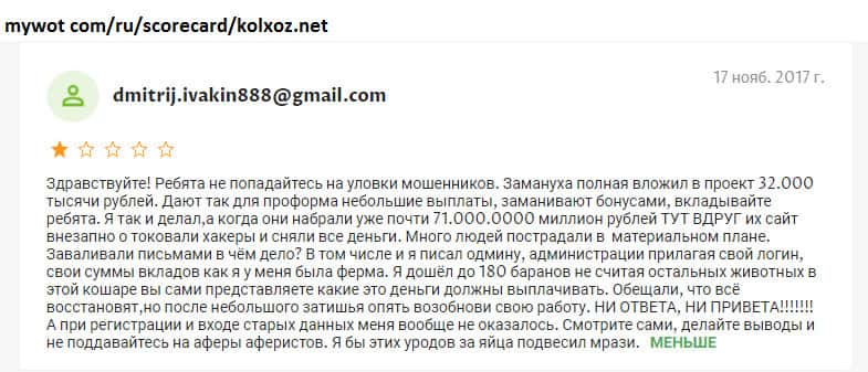 Пользователь купился на "заманчивые" условия псевдо игры Колхоз Нет и начал основательно прокачивать свою ферму! Для реального заработка не пожалел своих средств и вложился на 32 000 рублей! И начала ферма процветать и разрастаться! Капитал составил аж 71 000 000 рублей и "вдруг случайно" сайт шаражки атаковали хакеры! Все игроки обнулились!