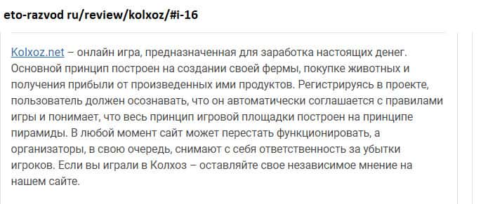 - Опытный пользователь не советует вкладывать свои деньги в пирамиду Колхоз Нет!