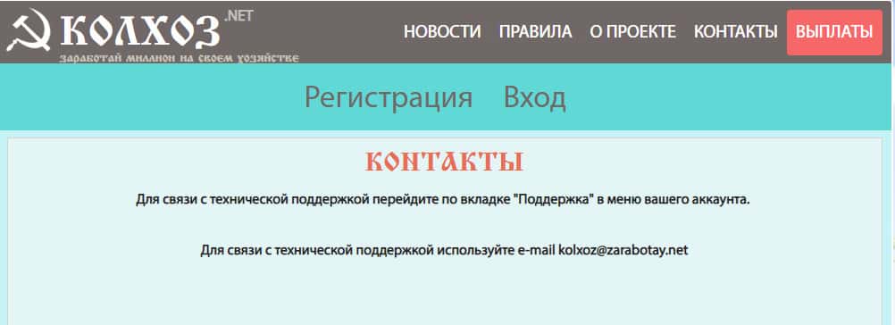 На официальном сайте лохотронщиков Колхоз Нет очень скромно указан всего один способ связи с технической поддержкой:
