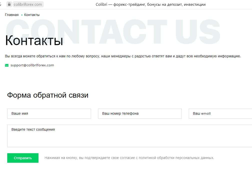 Проходимцы Колибри Финанс не горят желанием вести диалог с клиентами, и писать фейковые адреса им было лень. А потому, они указали только форму обратной связи для сбора данных для дальнейшего разводилова и веб-почту: