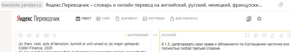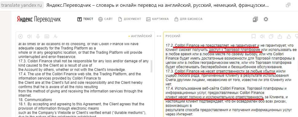 Прочитать условия договора проходимцев Колибри Финанс сможет только человек, владеющий английским языком. И перевести смогут не все, потому что на документах включена защита от копирования. Пробежимся по некоторым пунктам.
