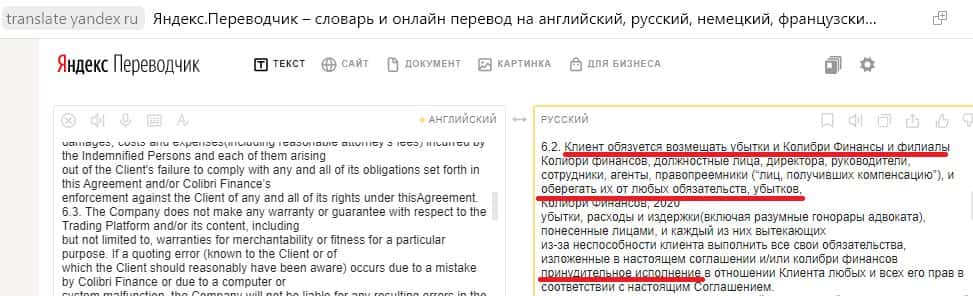 Клиент сам должен будет возмещать убытки и оберегать от любых обязательств недоброкеров Колибри Финанс.