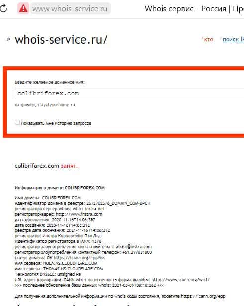 Данные о времени создания домена мы нашли через сайт whois domaintools com. Возраст шулерского домена colibriforex com составляет 174 дня!