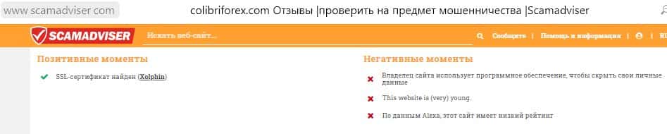 - Уровень доверия к жульническому сайту ColibriForex по оценке сайта Scamadviser