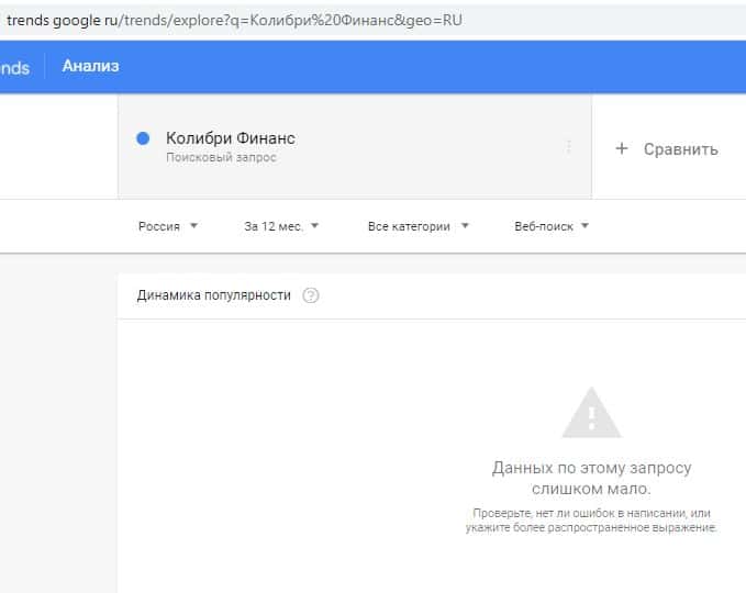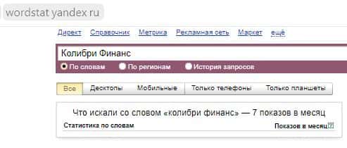 А по бренду "Колибри Финанс" в Яндекс запрашивали и того меньше, всего 7 раз за месяц.