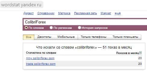 Количество запросов по названию сайта дублирует количество запросов по бренду ColibriForex, и составляет все те же 51 раз за месяц.