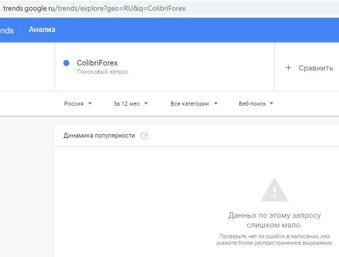 Анализ количества запросов по бренду "ColibriForex" также показал нулевой результат.