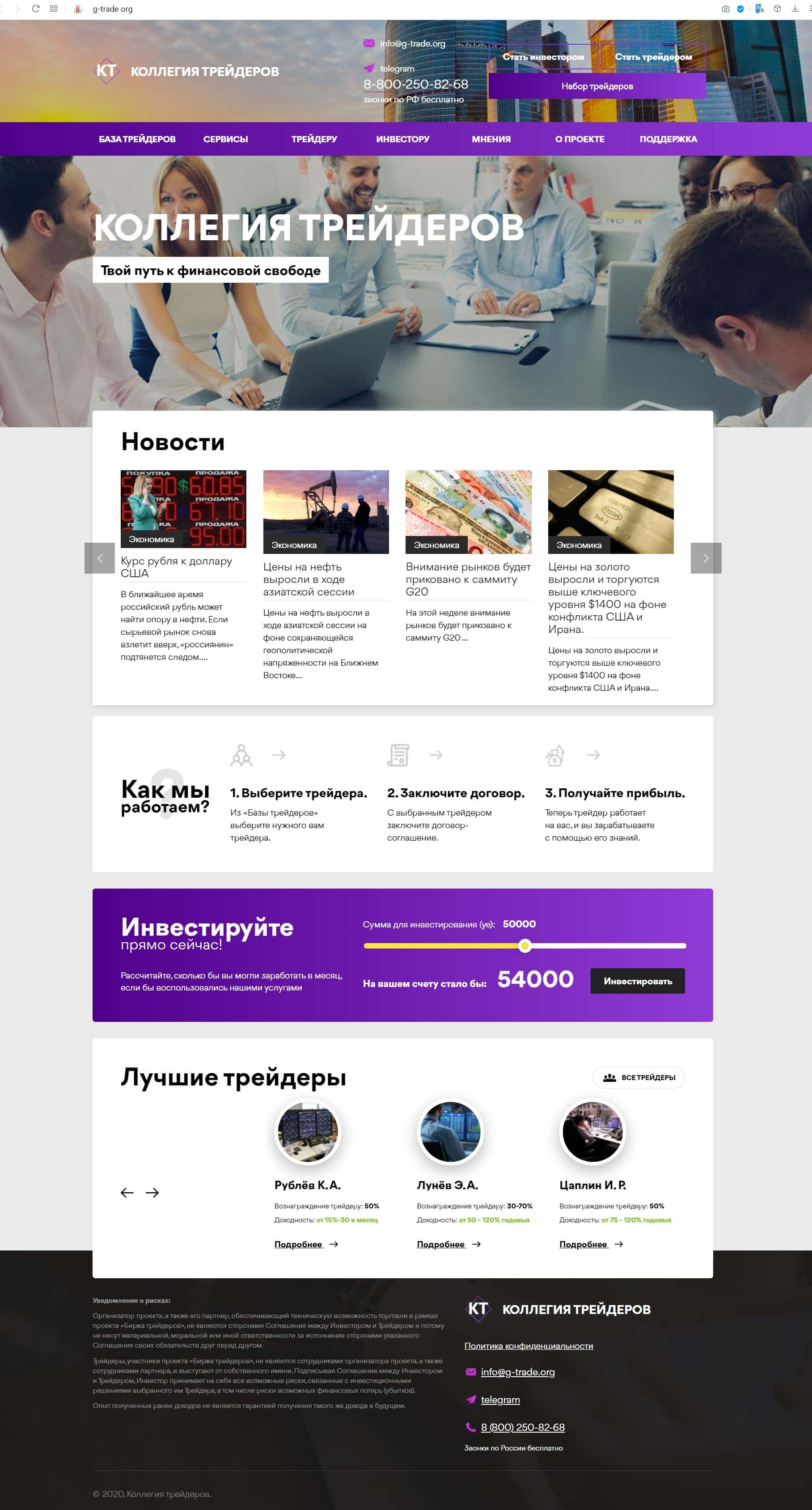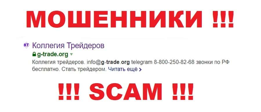 Коллегия Трейдеров - это стопроцентный лохотрон, который будет сливать каждого клиента, имеющего неосторожность начать работать с ним. Мошенники промышляют на популярном в наши дни поприще торговли на рынке форекс. Они создали свой подвальный ресурс, который у них называется информационным порталом, исключительно для грабежа людей. Аферисты передают пользователя своим трейдерам, список которых они выложили на сайте, а уж те позаботятся о том, чтобы как можно скорее завладеть депозитом клиента. Настоятельно не рекомендуется связываться с ворюгами под названием G-Trade Org во избежание денежных потерь!