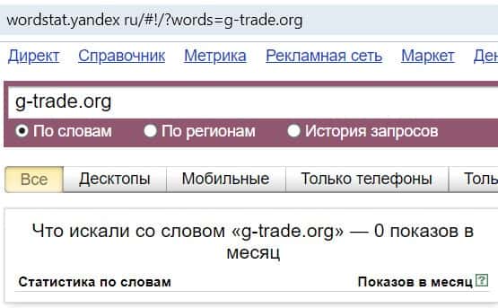 В поисковой системе Яндекс сайт шулерской конторы "g-trade.org", вбитый в строку с точкой, не искал никто. Контора явно не пользуется спросом у жителей России.