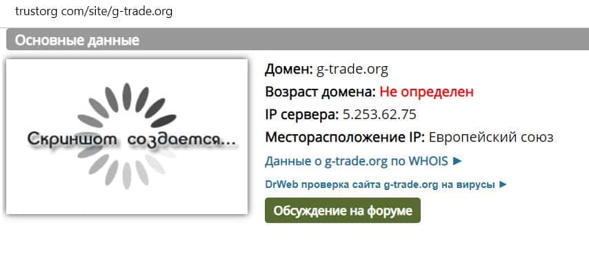 Возраст доменного имени сайта g-trade org, который принадлежит мошеннической конторе Коллегия Трейдеров, определить не удалось, так как данные об этом скрыты.