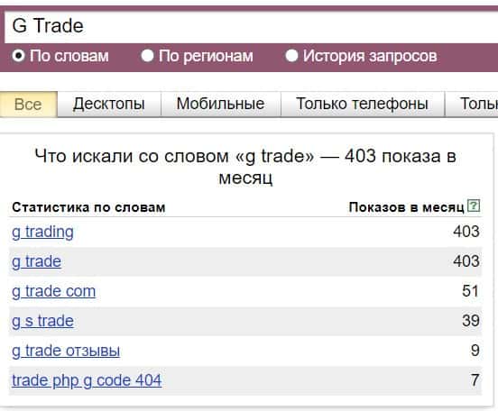 То же название "G Trade", но написанное с пробелом, люди пытались найти в системе Яндекс 403 раза.