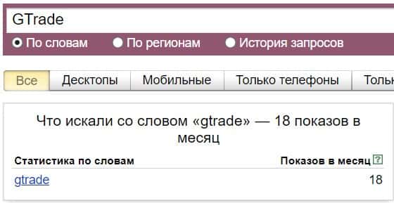 Название мошеннической конторы "GTrade", написанное на английском языке, пользователи искали в системе Яндекс нечасто - всего лишь 18 показов.