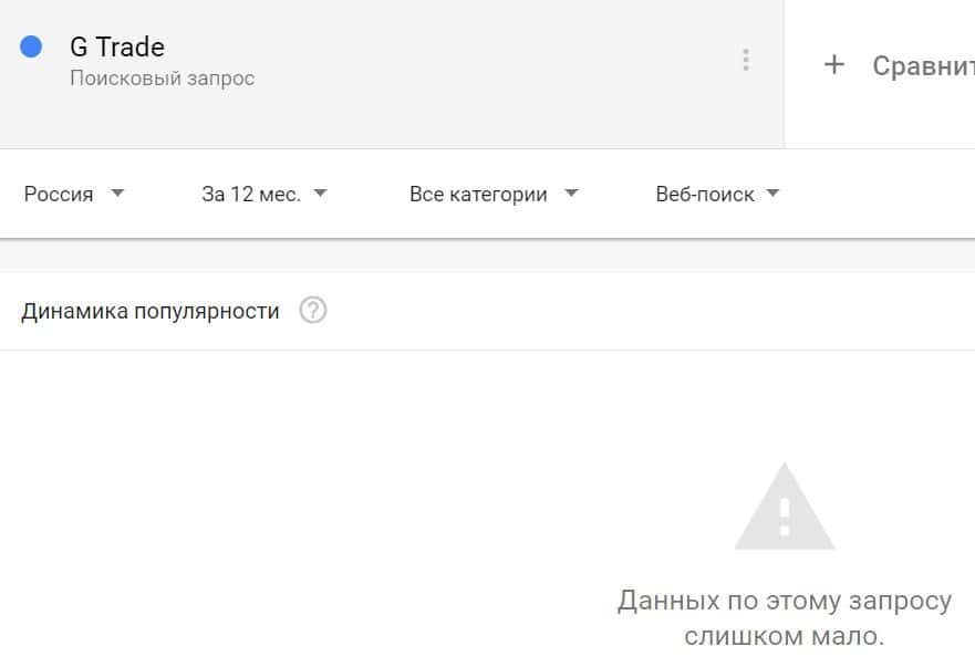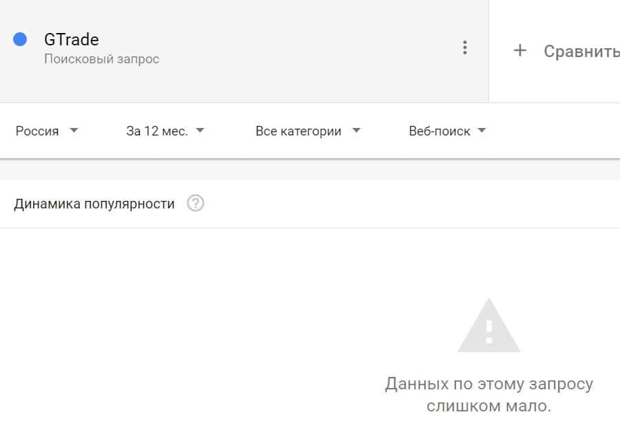 Посмотрим, насколько популярно название бренда "GTrade", написанное на английском языке. Данных по этому запросу нет, так как никто не искал этот бренд в Гугл.