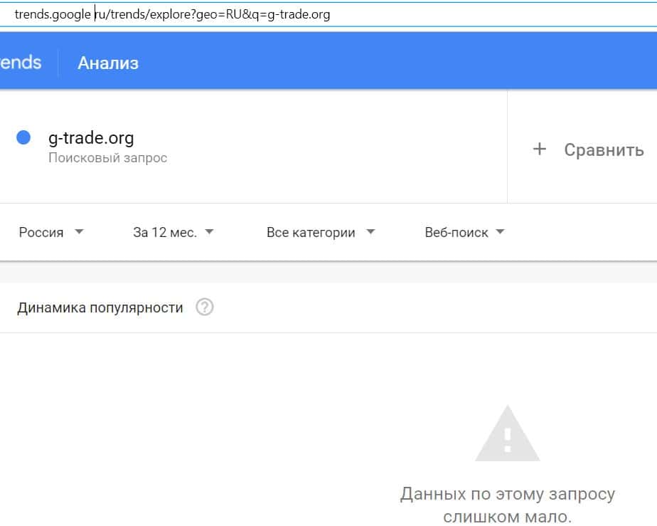 Доменное имя мошеннического сайта "g-trade.org" вбивали в поисковую систему Гугл слишком редко, поэтому данных по этому запросу практически нет.