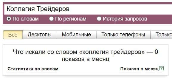 Посмотрим, сколько раз люди искали название бренда "Коллегия Трейдеров" на русском языке с пробелом: результат 0 показов.