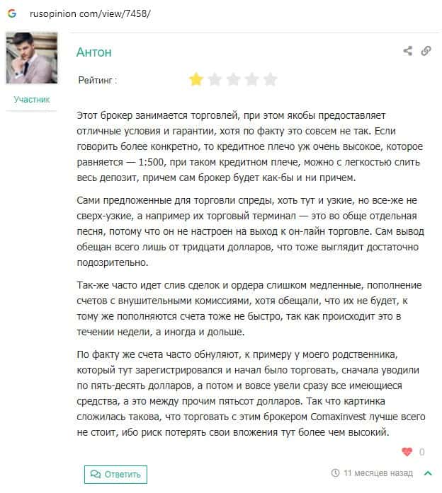 Ниже предоставлен еще один комментарий о том, что скам-брокер Comax Invest торгует против пользователей своего сайта, после чего попросту начинают игнорировать.