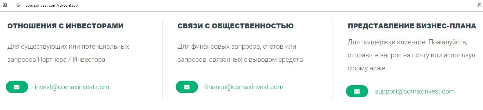 Жулики Comax Invest на своем официальном интернет-ресурсе указывают адрес электронной почты, а именно: