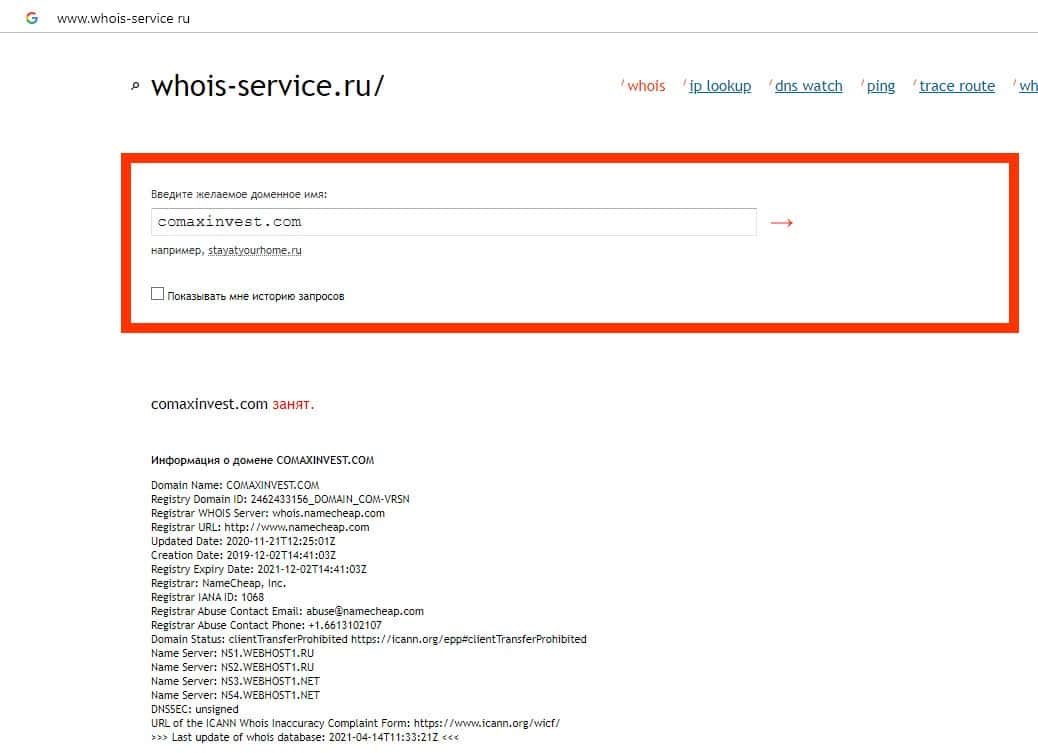 - Данные о владельце домена конторы Комакс Инвест отсутствуют