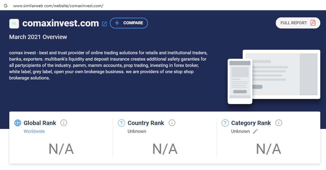 При проверке источников бренда по странам скам-брокера Комакс Инвест на сайте similarweb com, информация отсутствует, что является признаком фейковой компании.