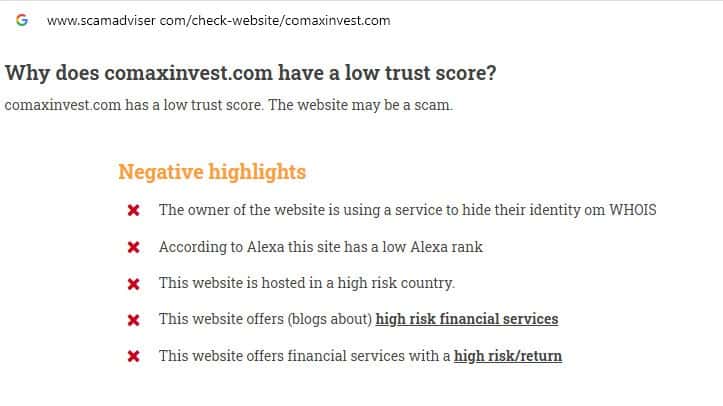 Проверка Comax Invest на сайте scamadviser com показала, что у данного сайта низкий рейтинг, а также выявлено множество отрицательных моментов в работе сервера.
