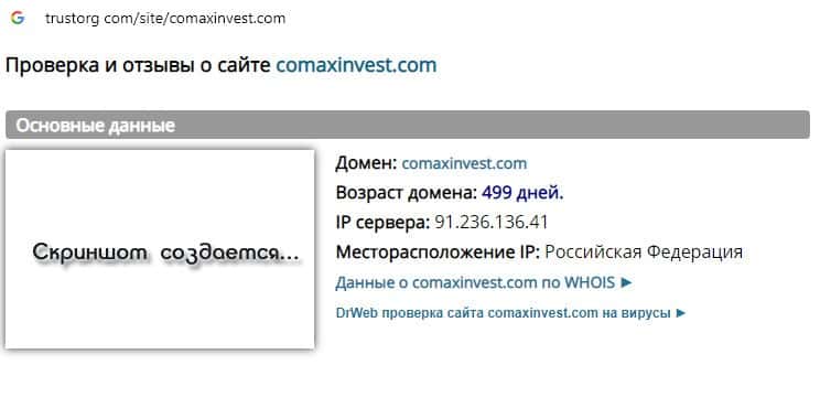 Проверка онлайн-сервиса лохотрона Комакс Инвест на trustorg com показала, что возраст домена к моменту написания статьи составляет 499 дней, вероятнее всего домен купленный.