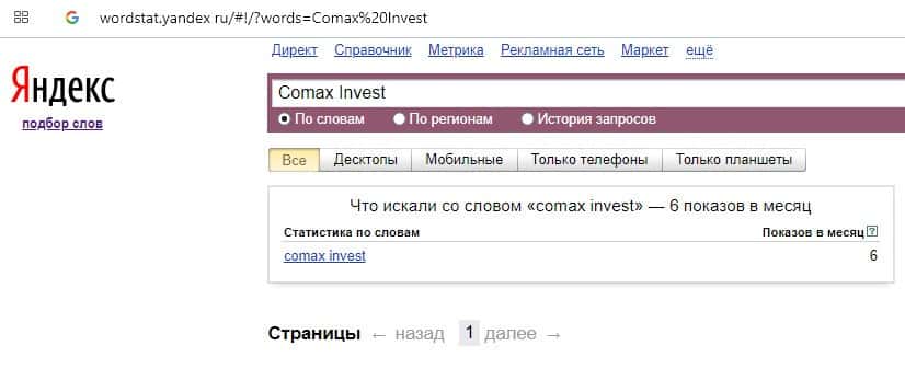 Количество запросов по бренду англоязычного названия компании "Comax Invest" на Яндекс Вордстарт составляет всего 6 показов за месяц.