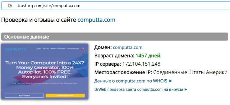 Проверка интернет-портала лохотронщиков Компутта на trustorg com показала, что возраст домена к моменту написания статьи составляет 1457 дней, скорее всего домен купленный.