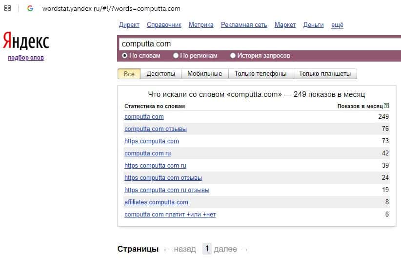 Количество запросов по бренду название домена компании "computta.com" на wordstat yandex ru составляет 249 запросов за месяц.
