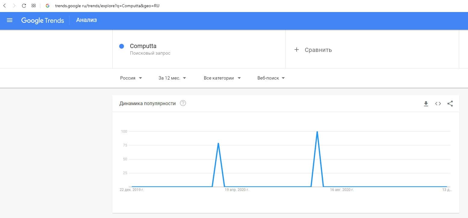 Количество запросов по бренду названия компании на английском языке "Computta" на Трендс Гугл Ру отображено на графике предоставленном на скриншоте ниже.