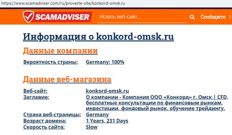 В связи с явно мошеннической и противозаконной деятельностью жулья Konkord Omsk его реальные руководители предпочитают анонимность дабы избежать ответственности со стороны правоохранительных органов. Техническую же информацию о сайте шулеров Конкорд Омск можно узнать с помощью портала scamadviser com, что вы можете увидеть ниже.