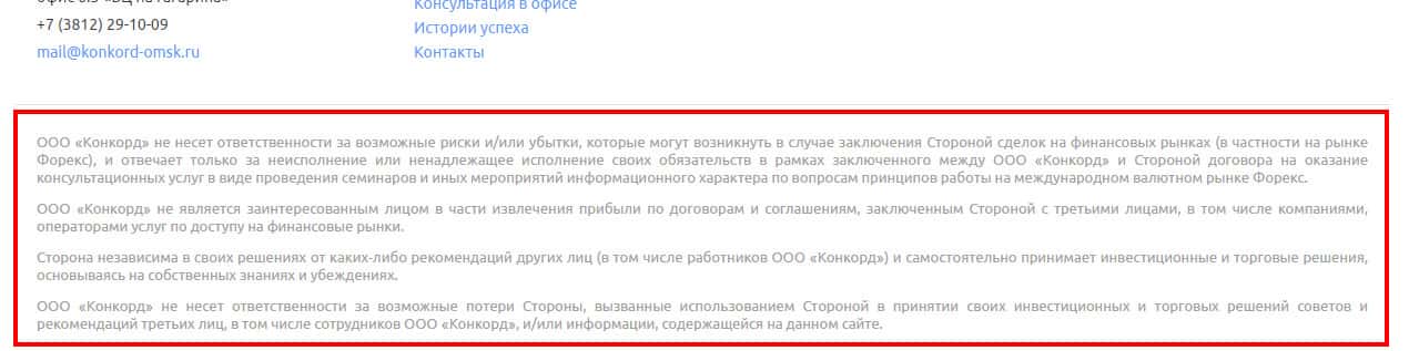 Завершается сайт у шулеров Конкорд Омс вполне ожидаемо, а именно условием о том, что шулера Konkord Omsk банально снимают с себя ответственность за убытки пользователей, а так же контактной формой для связи с клиентурой в сети интернет. На изображении, расположенном ниже, вы можете наглядно увидеть окончание подвального сайта аферистов Конкорд Омск.