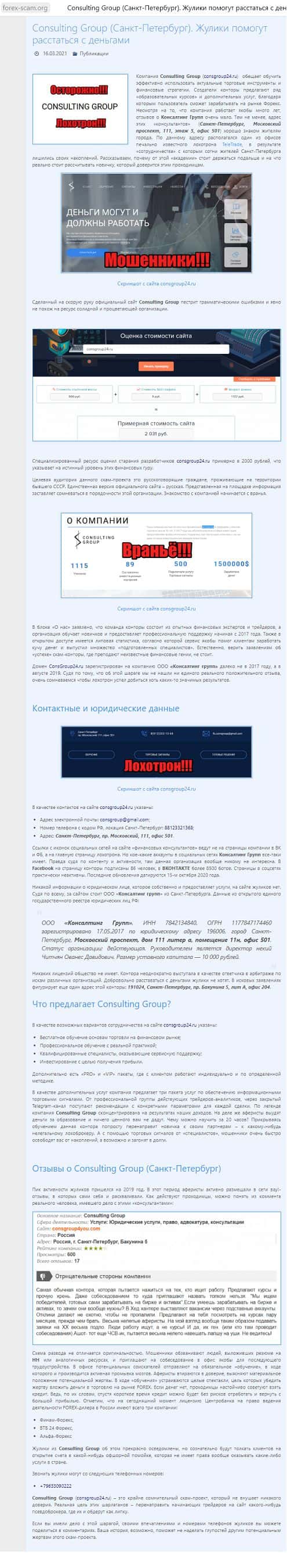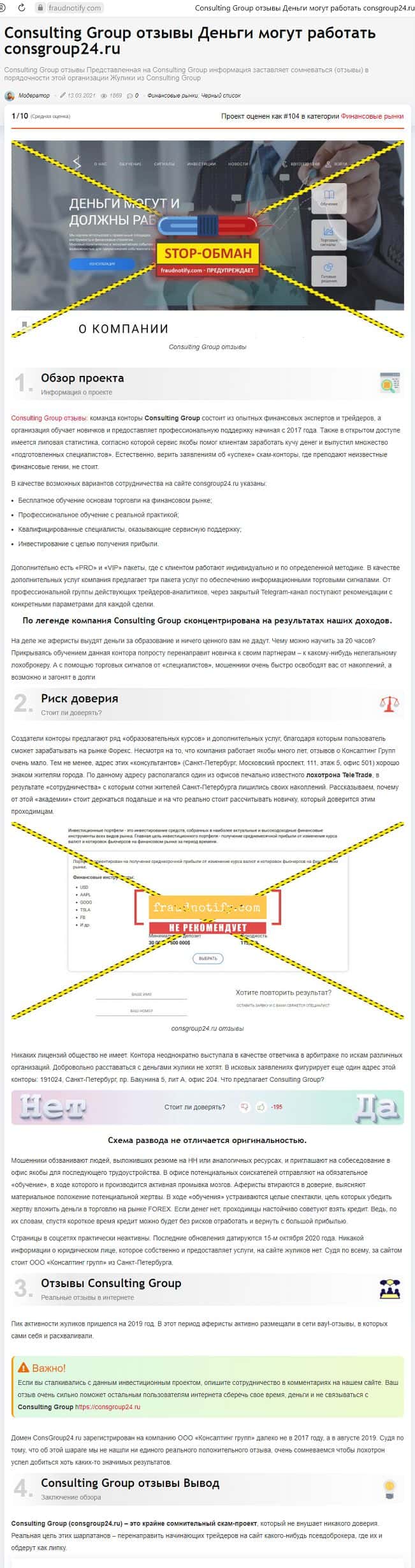 Сайт forex-scam org дает ряд обоснованных причин, почему от "академии" Консалтинг Групп следует держаться подальше.
