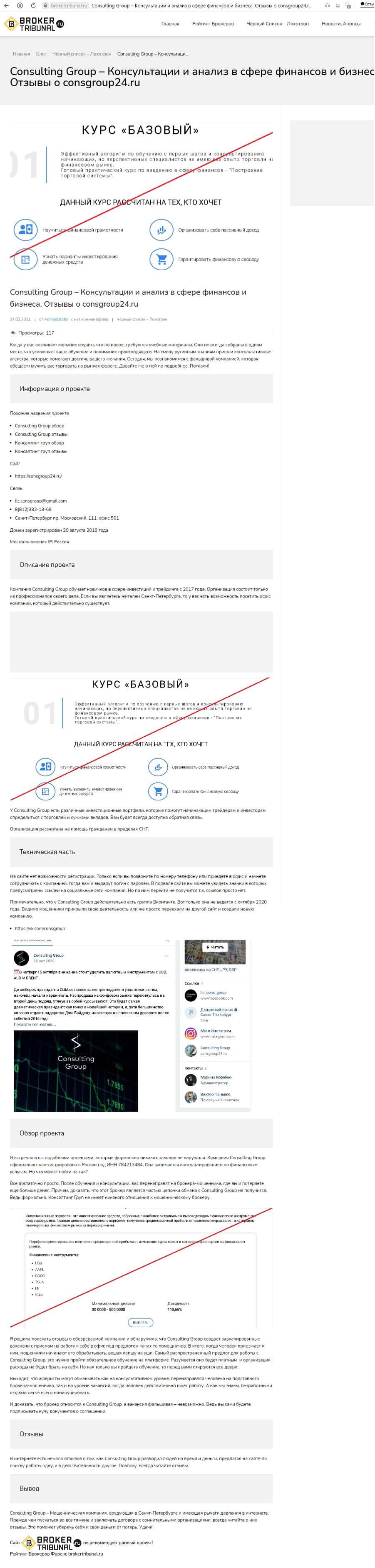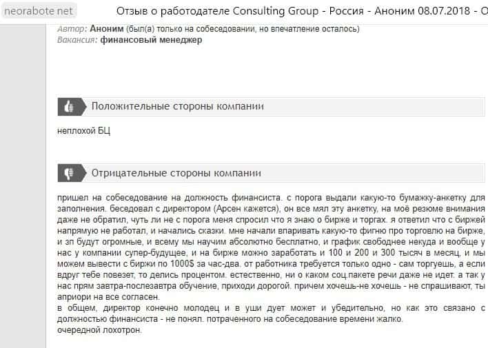 Аналитики сайта brokertribunal ru также пришли к утверждению, что Консалтинг Групп мошенническая компания, от которой надо держаться как можно дальше.
