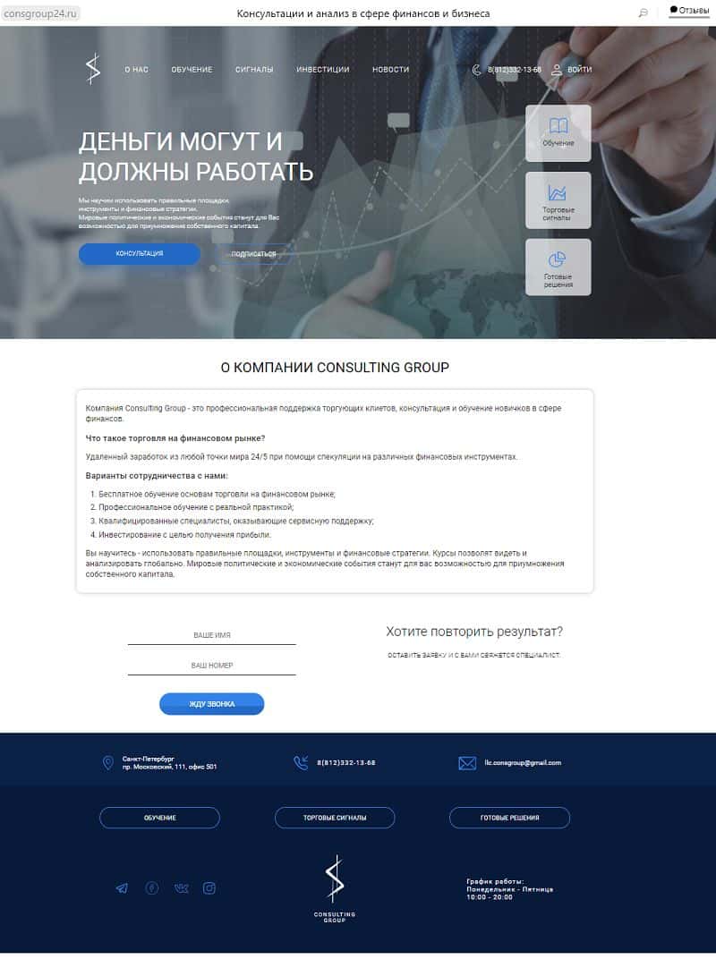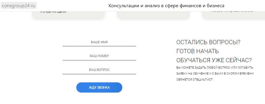 Каждый раздел заканчивается тем, ради чего, собственно все и делалось - формой для введения своих данных и телефона. Это - лазейка для ушлых разводил Консалтинг Групп.