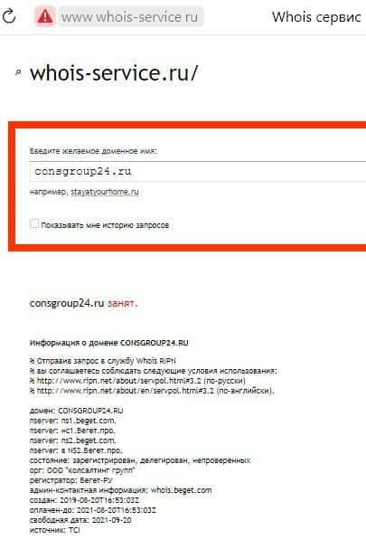 - Возраст мошеннического домена consgroup24 ru