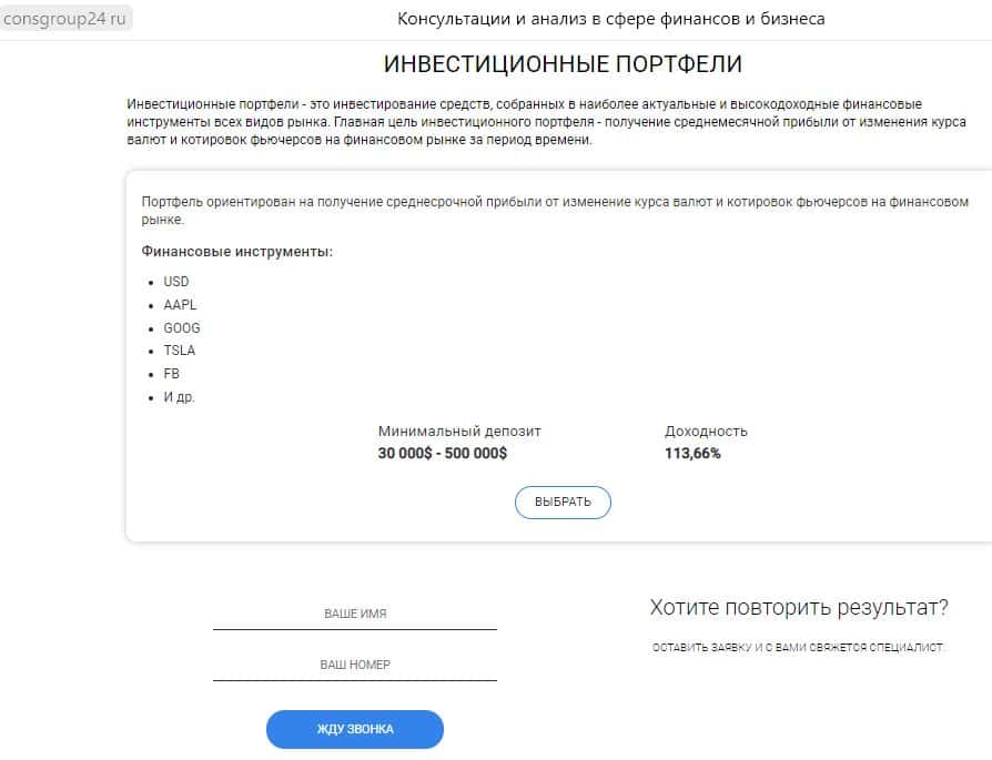 Наиболее выгодная для лохоразводил Консалтинг Групп ловушка - инвестиционные портфели. Минимальные суммы вложений здесь от 30 000 долларов.