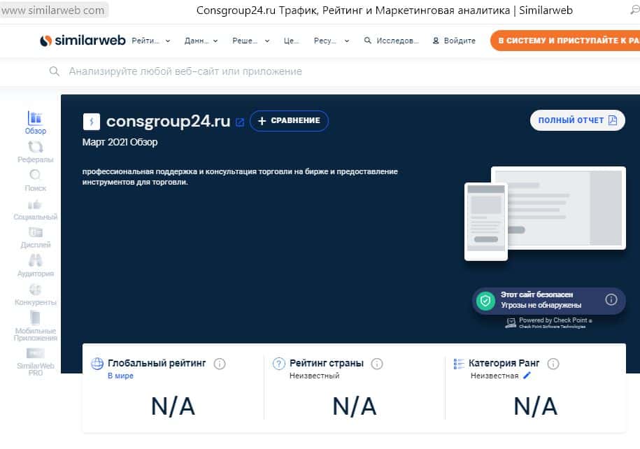 На сайте SimilarWeb информация об источниках трафика мошеннического сайта consgroup24 ru отсутствует, что является признаком натурального лохотрона.